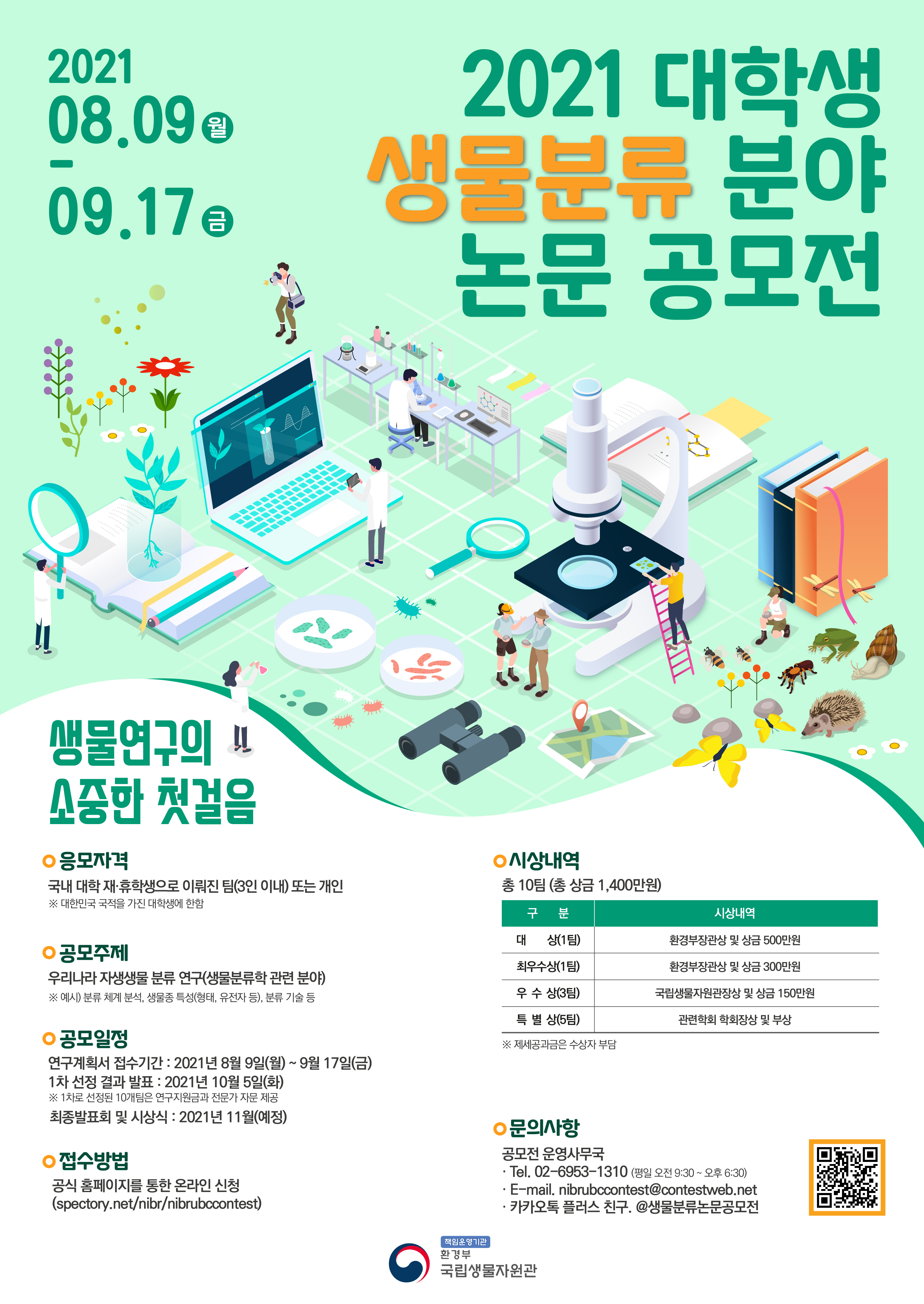 국립생물자원관에서는 우리나라 생물 연구의 토대가 되는 생물분류학의 중요성을 알리고, 자생생물 분류 전문가를 양성하기 위해 "2021 대학생 생물분류 분야 논문 공모전"을 개최합니다. 관심 있는 대학생들의 많은 참여 바랍니다. 이외 자세한 내용은 공모전 홈페이지에서 확인해주세요