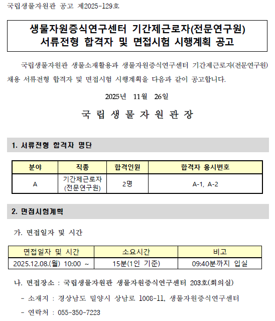 제목 생물소재활용과(생물자원증식연구센터) 기간제근로자 수시채용 서류전형 합격자 및 면접시험 시행계획 공고