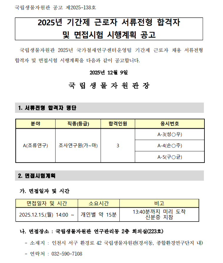 제목 국립생물자원관 국가철새연구센터운영팀 기간제근로자(조사연구원)서류전형 합격자 및 면접시험 시행계획 공고